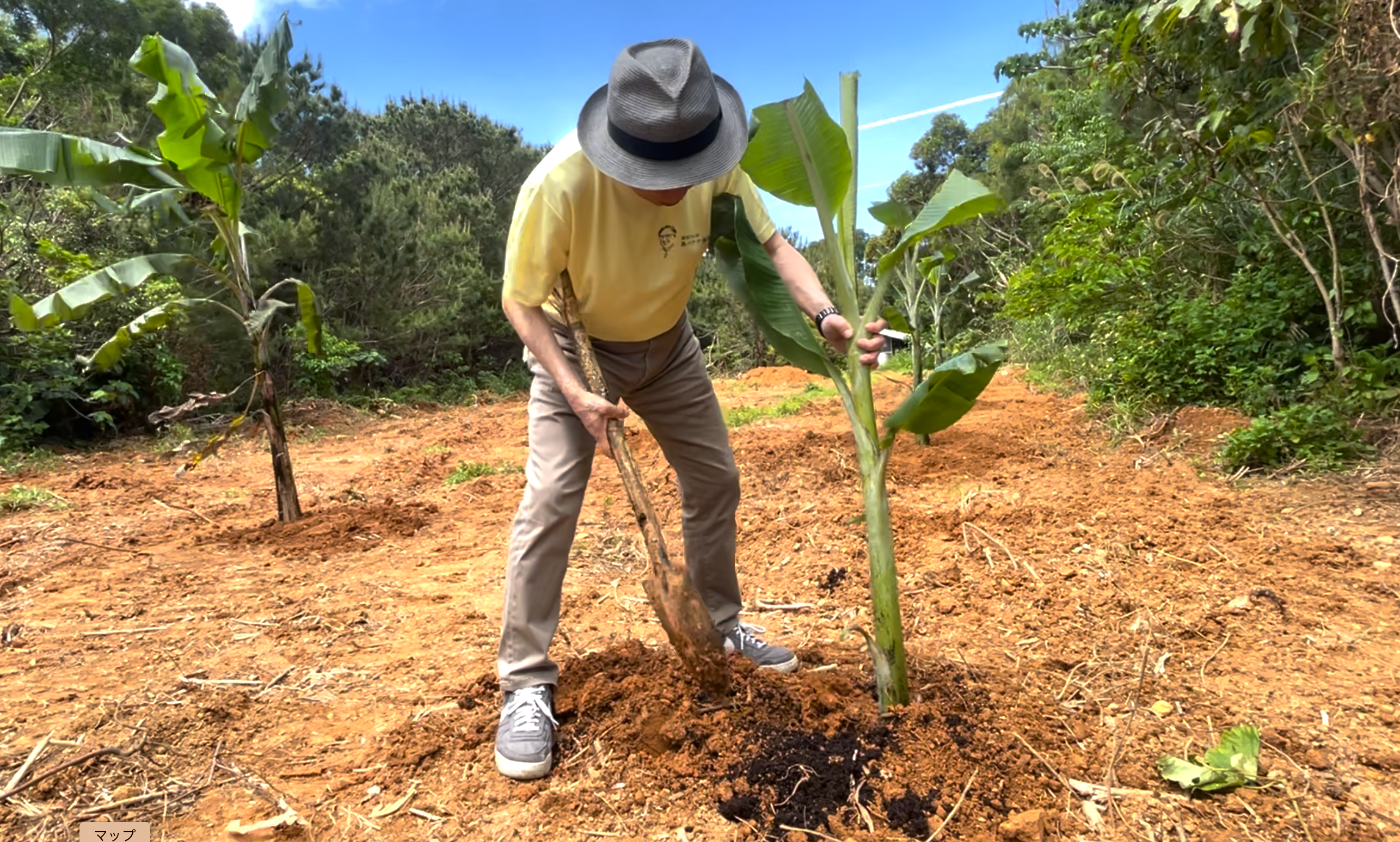 私たちは、その「島バナナの遺伝子」をもつ島バナナの苗を、遺伝子分析のため葉を採取させていただいた農家の酒井さんから譲り受けて、「森田さんの島バナナ農園」の最初の定植をしました。