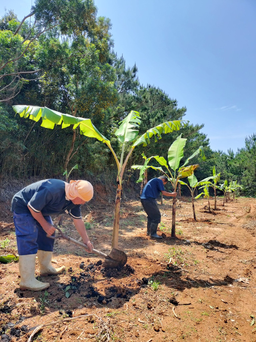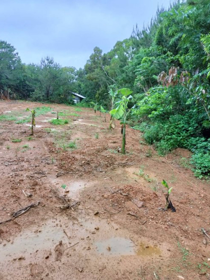 4月3日、開園の日、代表森田はじめみんなで、島バナナの苗を13本植えました。