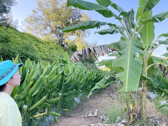その後、屋我地に農場を拓き、現在、100 本ほどの島バナナが育っていますが、試験的に、台風対策の防風林として、島バナナ株のすぐ隣にウコンを密に植えてあります。