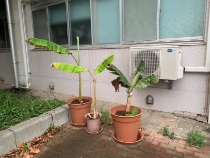 以前訪ねた時には小さかった、小谷先生の研究室玄関前の「キングバナナ」が、大きく成長していました。