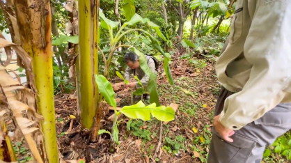 沖縄県立農業大学校で千葉大学 文学部教授 小谷真吾さんに遺伝子証拠標本として島バナナの葉を採取していただきました。 2024/2/28