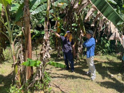 以前訪問させていただいた「道の駅やんばるパイナップルの丘 安波」の代表である森本さんのご紹介により、謝敷で空き家管理をしながら、様々なバナナを栽培されている友寄さんに島バナナなどのバナナを中心にお話していただきました。