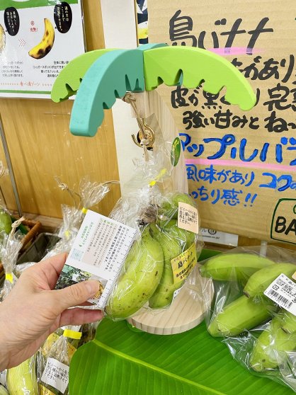 島バナナの茎の最上部から1段目に実った島バナナの下のほうに垂れ下がった花を、通常は切り落とすことで1段目の実の栄養確保とするところ、それをせずにいると垂れ下がった先にさらに、小ぶりな島バナナが実ることを教えていただきました。