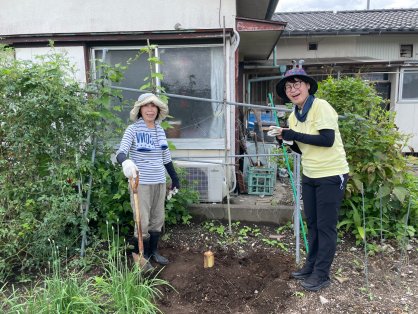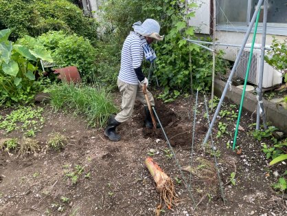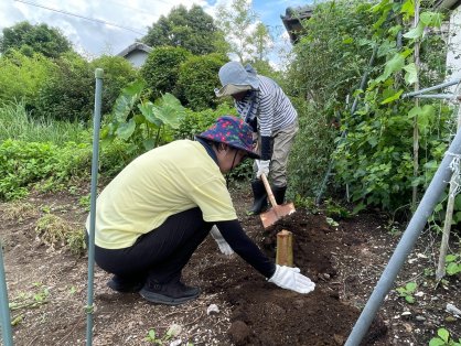 家庭菜園の畑・お庭で、アサガオの前に穴を掘って植えていただきました。