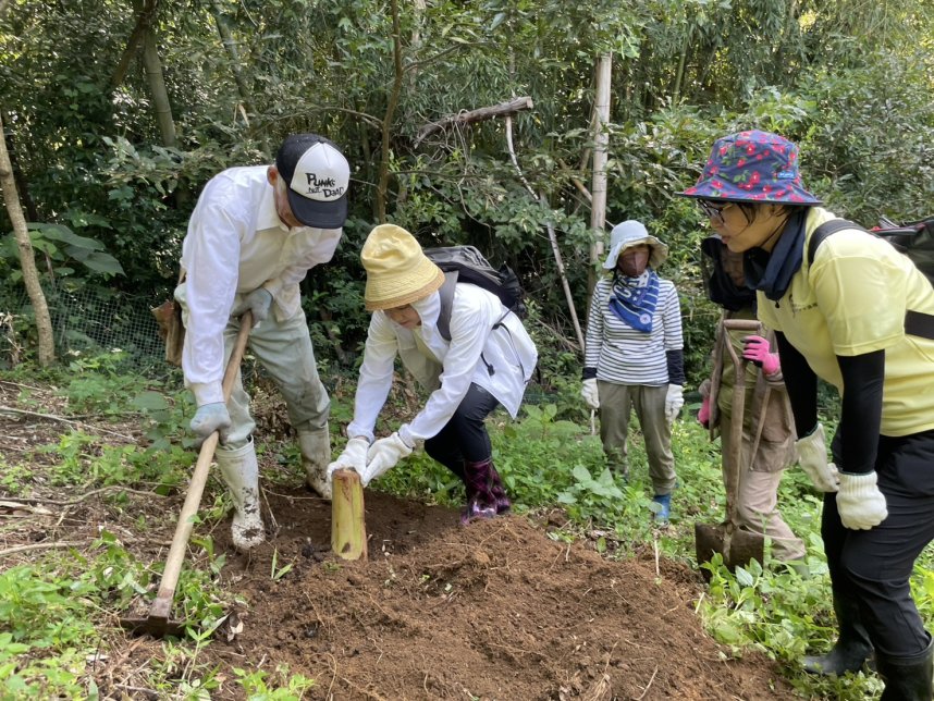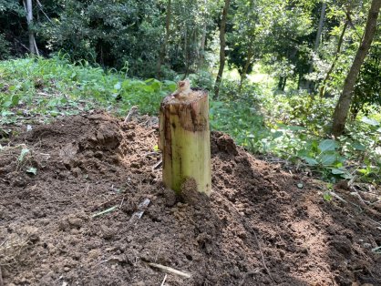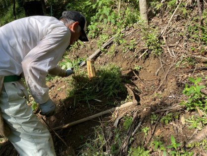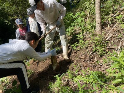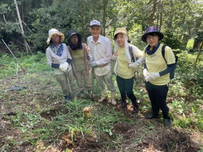 今回の島バナナは、その果樹園の空いている場所に穴を掘り、他の果樹と同じように、牛糞と米ぬかを混ぜた堆肥で植えられました。
